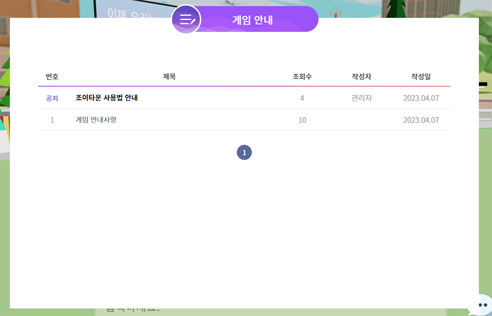 - 광장의 스크린에서 게시판 및 공지사항을 확인할 수 있다.