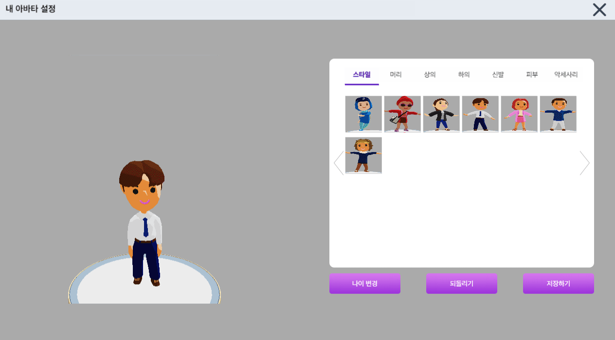 카테고리별로 스타일과 머리, 상/하의, 잡화로 자신만의 캐릭터로 꾸밀 수 있으며, 원하는 색상으로 변경하여 커스텀도 가능하다.